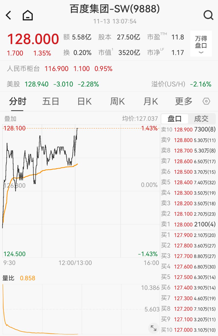 今日百度港股股价震荡拉升,截至13:07,报128港元/股,涨1.35%,总市值为3520亿港元。